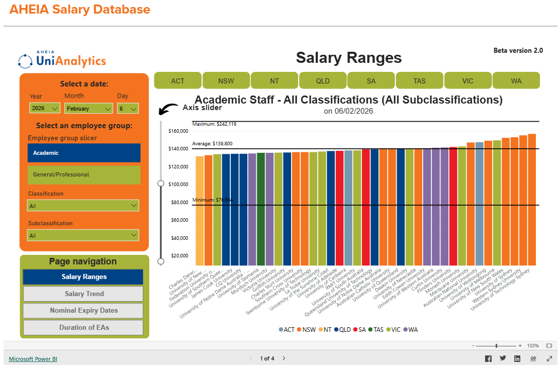 We’re pleased to highlight the Salary Database, an interactive resource available to all AHEIA members. The database has been developed to support members in comparing and benchmarking their university against sector peers and relevant comparison groups. These insights can be particularly useful in informing Enterprise Bargaining and broader workforce planning.